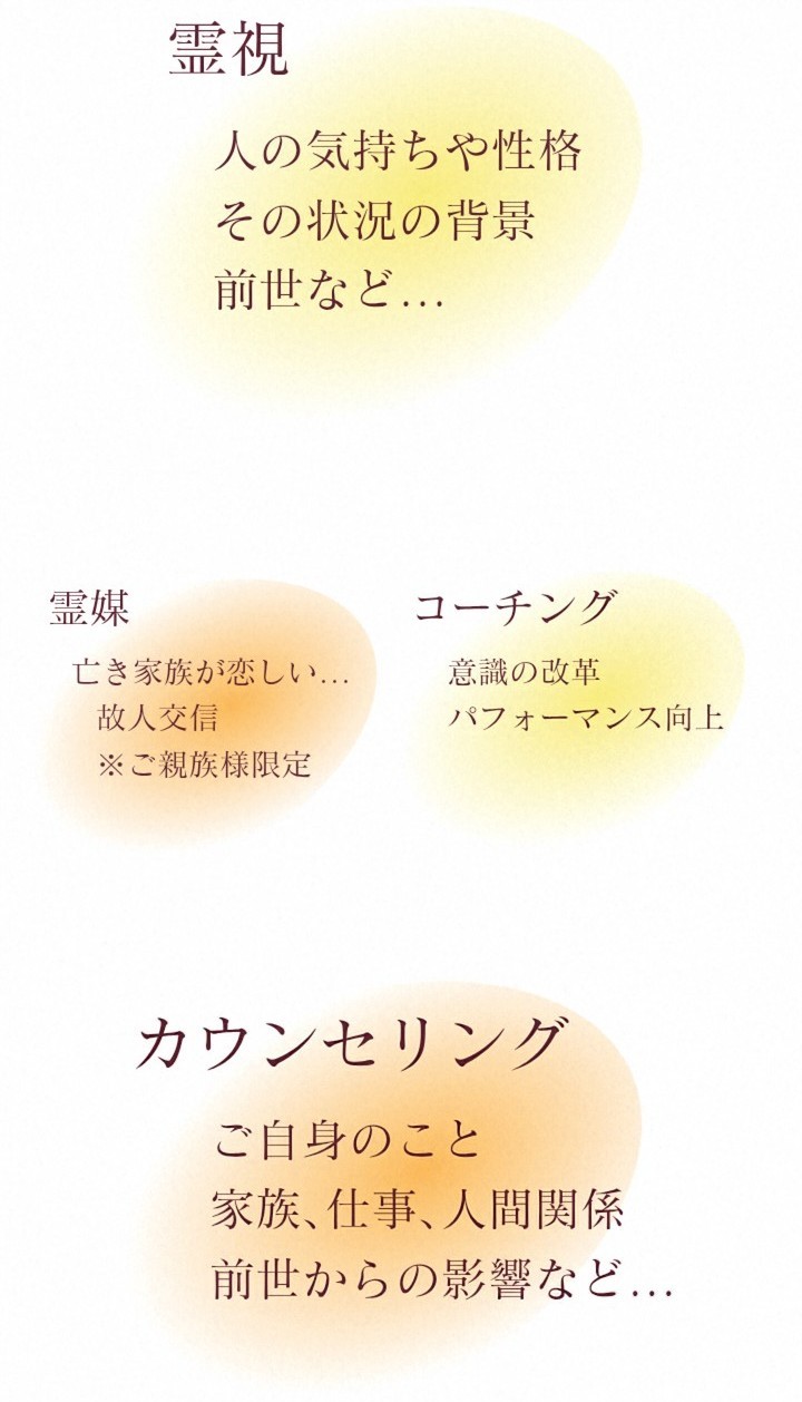人生相談、人間関係、ご家族、ご家庭、子育て、お仕事、職場、ご自身のこと、過去のこと、前世からの影響、亡くなられたご家族様のこと...など。